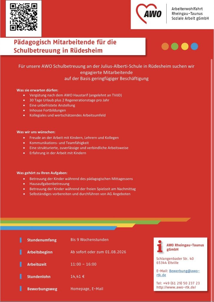Ab dem Schuljahr 2025/26 freuen wir uns besonders, mit der TG Rüdesheim einen starken Partner gewonnen zu haben, der den Nachmittag mit vielfältigen bewegungsorientierten Angeboten bereichert. Bewegung ist für Kinder eine wesentliche Grundlage ihrer Entwicklung – sie fördert nicht nur die motorischen Fähigkeiten, sondern stärkt auch Konzentration, Selbstvertrauen und das soziale Miteinander. Durch diese Kooperation wollen wir den Kindern noch mehr Gelegenheit bieten, sich aktiv und gesund zu entfalten.